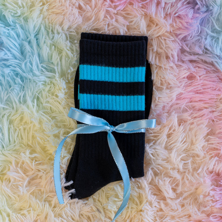 This BLACK PAIR OF CREW SOCKS (with blue stripes) are a lovely addition to your summer outfit. These Electric Seahorse crew socks go great with any outfit and a touch a color to those of you who dress in all black! I like to wear them to the gym and or when I'm hanging out at home watching anime. They work great with shorts and joggers. They are comfortable and durable but be sure to hang dry them to avoid shrinking. These come in one size.