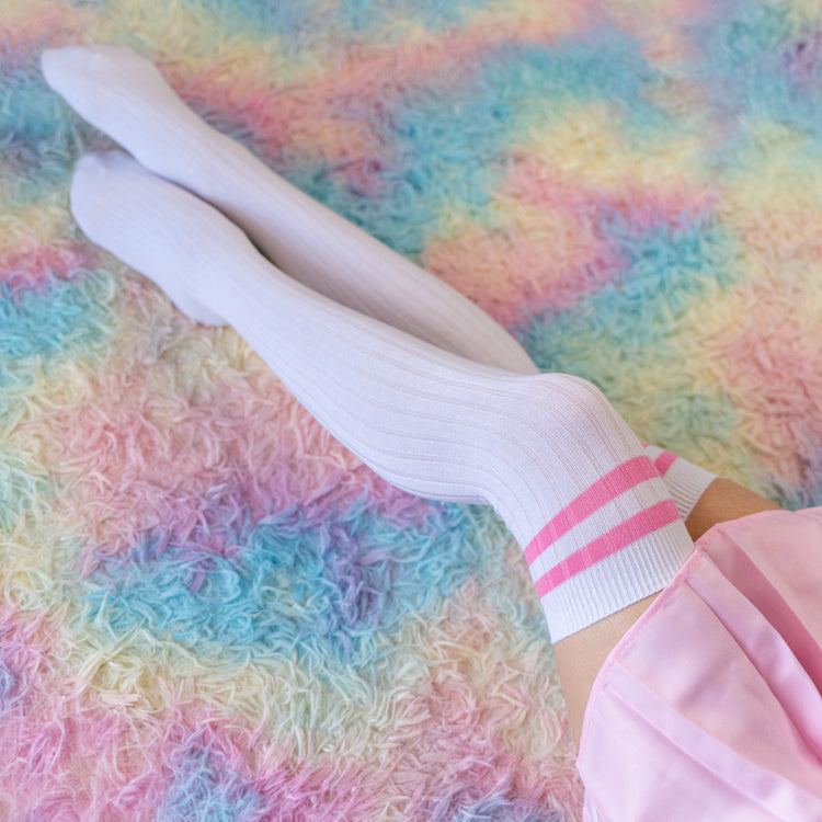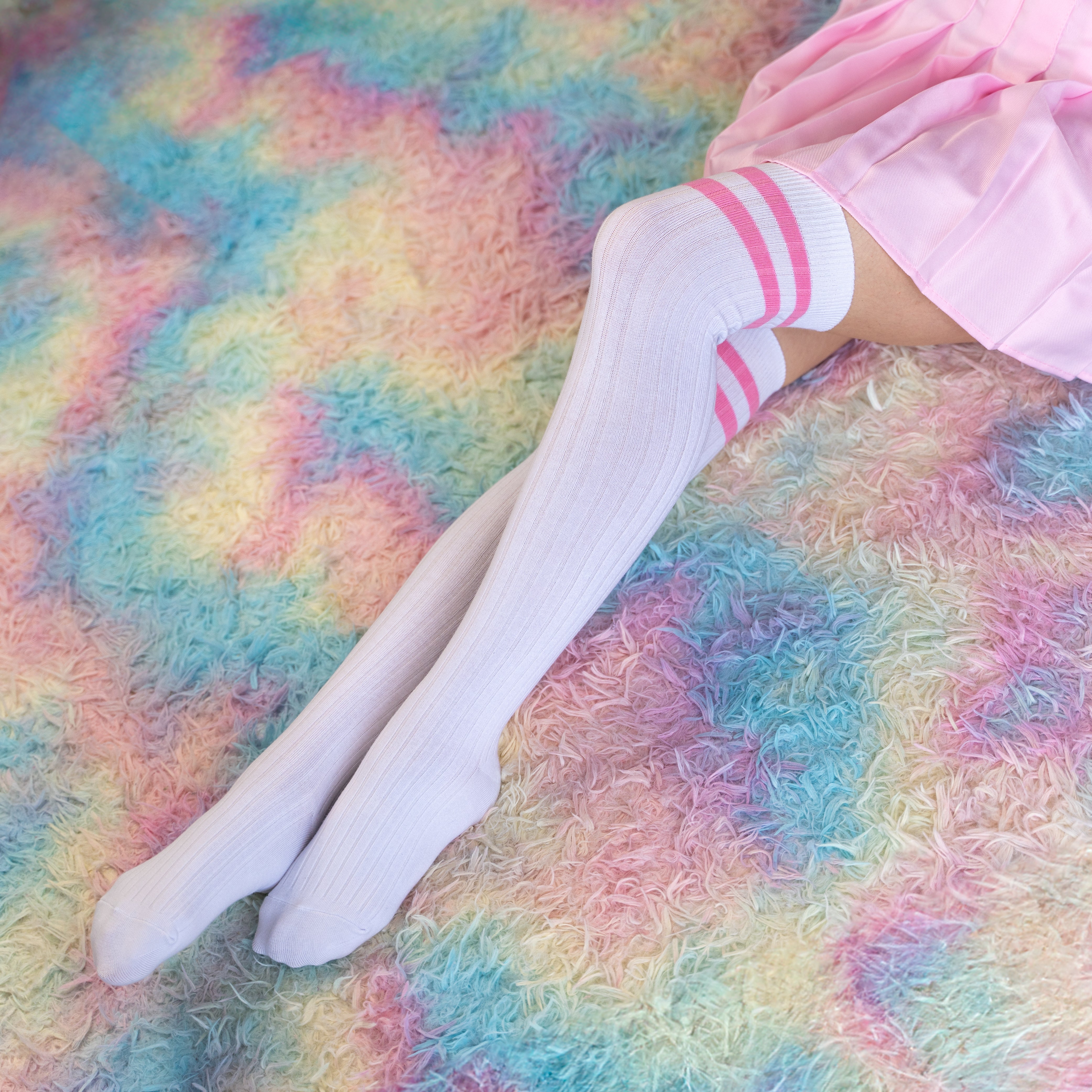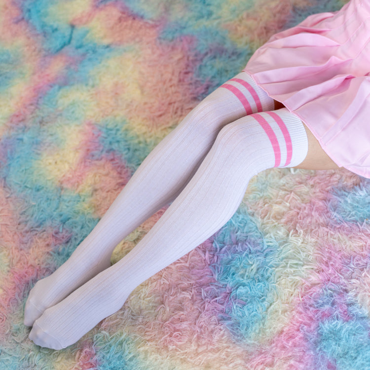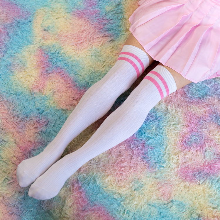 This WHITE PAIR OF SOCKS WITH PINK STRIPES are the perfect pair of socks for anyone who likes to game, stream, or just look super kawaii! These cute socks were originally designed for girls by a girl (Me) but anybody can wear them! They are made to sit over the knee and look great with a cute skirt and crop top or an oversized t-shirt or hoodie. They are comfortable and durable but be sure to hang dry them to avoid shrinking. These come in one size.