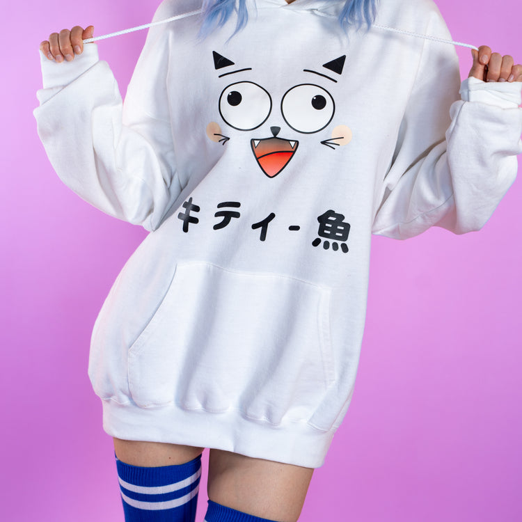 This Comfy Hoodie is like a cross between Streetwear and anime. The face is based off of my kittyfish logo and it looks great with the Japanese lettering underneath it. I love to wear this Hoodie a few sizes up so it's baggy and I usually pair it with my favorite high knee socks for a cute casual look.ย